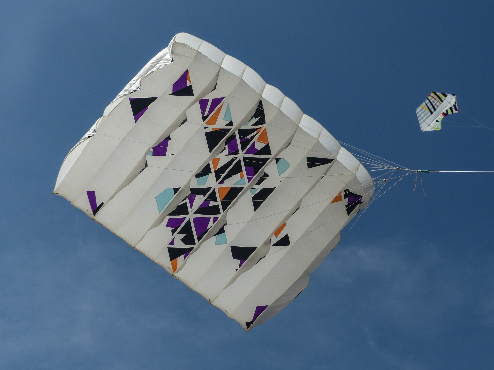 The project today was to fly the two parafoils together. We started with the larger 1991 kite on about 50m of 4mm braided spectra. Once we had it in the air and it appeared settled we set about launching the smaller 1990 kite which was flown from the same ground anchor.
