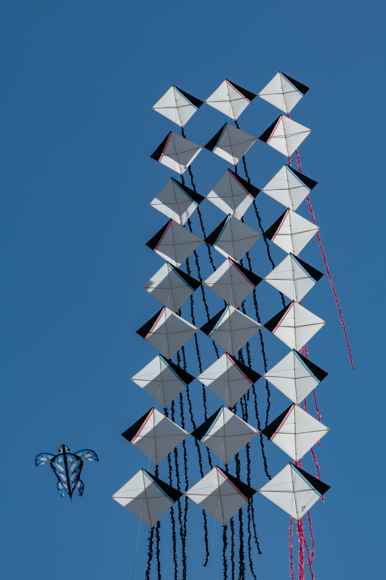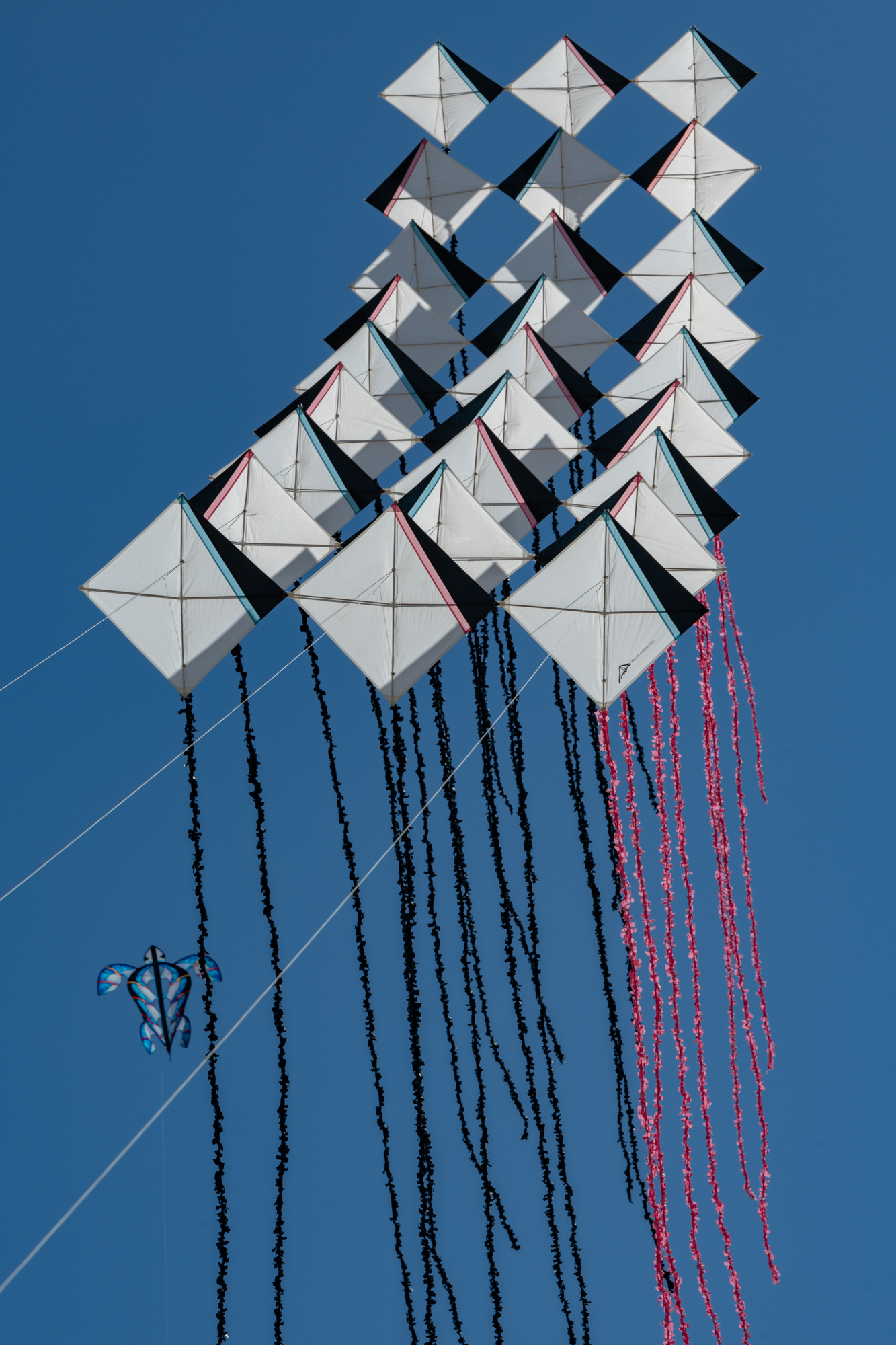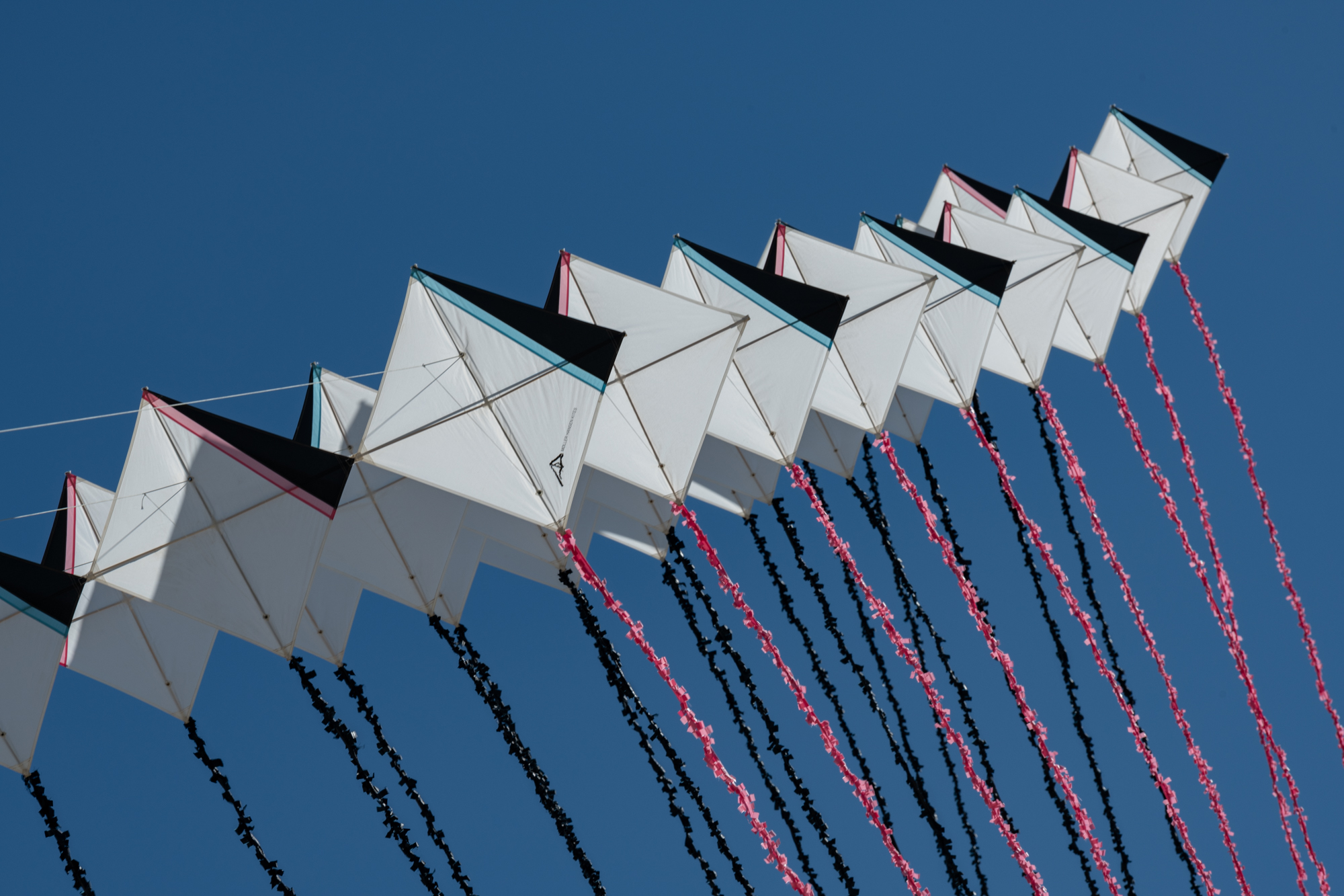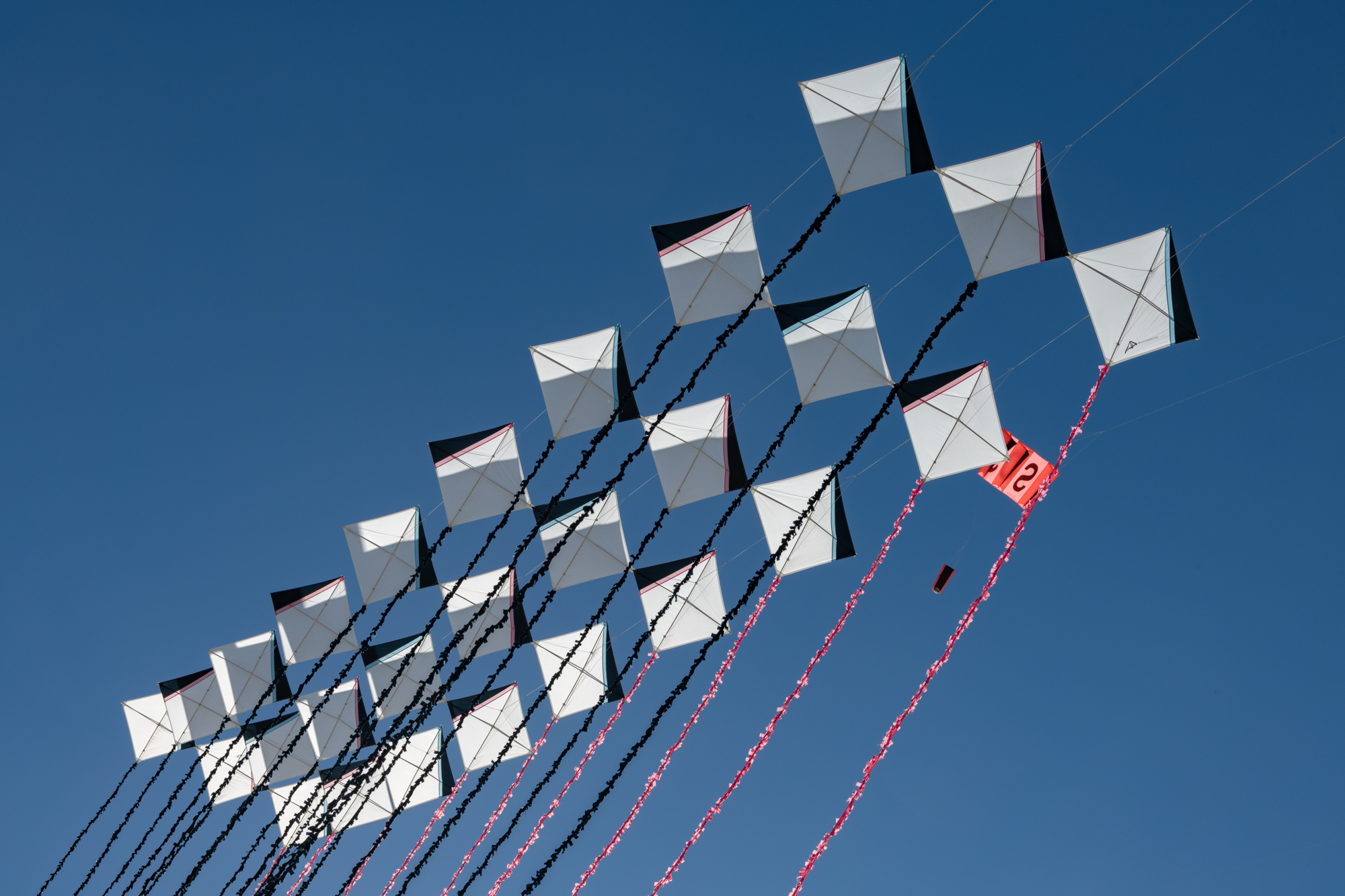 The two stacked kites were prepared for the afternoon session, launched together and walked into the arena.